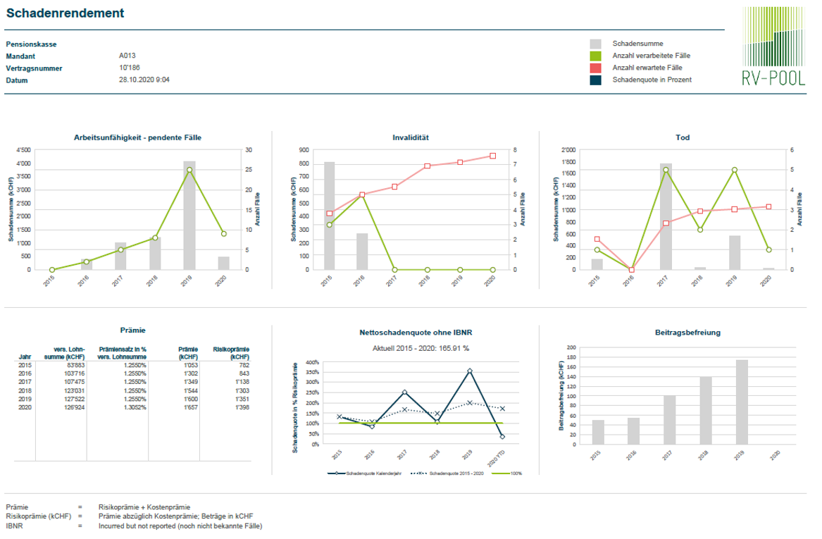 Um die Kosten der Risikoleistungen einer Pensionskasse optimal steuern zu können brauchen die Führungsorgane Stiftungsrat und Geschäftsführer neben einem proaktiven und erfolgreichen Leistungsfallmanagement auch ein aussagekräftiges Reporting. Aus einem solchen Reporting ersehen die Führungsorgane sofort, wie sich der Schadenverlauf über die Zeit entwickelt, wie der Schadenverlauf gegenüber den technischen Grundlagen ausschaut und wie hoch die aktuelle Schadenquote (effektiv eingetretene Schäden gemessen an der bezahlten Prämie) ist.