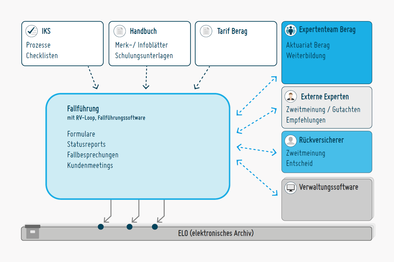 Die BERAG hat basierend auf ihrer langjährigen Erfahrung eine eigene Fallführungssoftware entwickelt – RV-Loop. Diese Software ermöglicht es, rasch und einfach alle Leistungsfälle zentral zu erfassen und alle relevanten Abfragen und Auswertungen zu erstellen. RV-Loop ist via Schnittstelle an die gängigen PK-Verwaltungs- und Archivsysteme angebunden, sodass keine unnötigen Doppelerfassungen von Versichertendaten nötig sind.