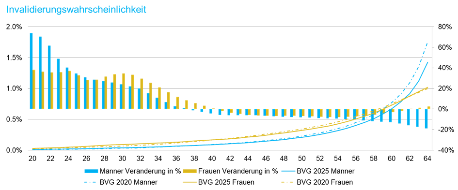 Die Autoren der Grundlagen haben festgestellt, dass im Gegensatz zu den vergangenen Ausgaben BVG 2015 und BVG 2020 «die Wahrscheinlichkeit einer Invalidität zugenommen hat». Wird die Entwicklung aber detailliert betrachtet, ist eine Erkenntnis zentral: Die Invalidisierungswahrscheinlichkeit von jüngeren Versicherten unter 40 Jahren ist deutlich gestiegen (bspw. +35% bei einer 30jährigen Frau), während sie bei älteren Versicherten abgenommen hat (bspw. -8% bei einem 50jährigen Mann). Eine generelle Aussage zur Invalidisierung ist deshalb irreführend, vielmehr ist diese abhängig von der Bestandeszusammensetzung eines versicherten Kollektivs.