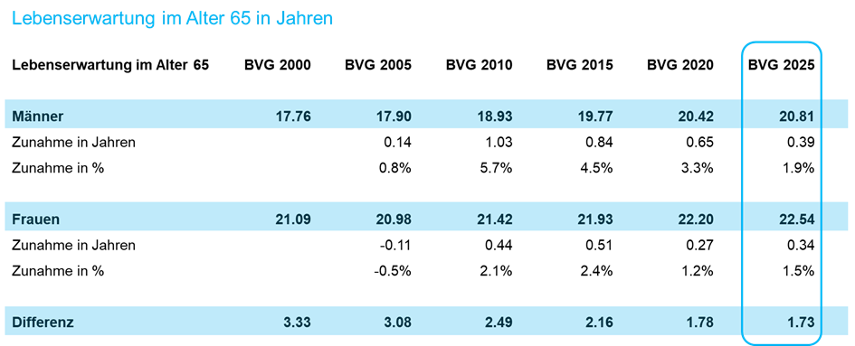 Wie die Vorgänger BVG 2015 und BVG 2020 bieten die technischen Grundlagen BVG 2025 erneut sowohl Daten basierend auf Periodentafeln als auch auf Generationentafeln an. Während Periodentafeln auf eine bestimmte Beobachtungsperiode fokussieren, berücksichtigen Generationentafeln die prognostizierte zukünftige Zunahme der Lebenserwartung. Für die Hochrechnung der Lebenserwartung stützen sich die BVG 2025 auf das bereits verwendete Modell des Bundesamtes für Statistik (BFS), das mit aktuellen Bevölkerungsdaten aktualisiert wurde, jedoch unverändert gegenüber der Version von BVG 2020 ist.