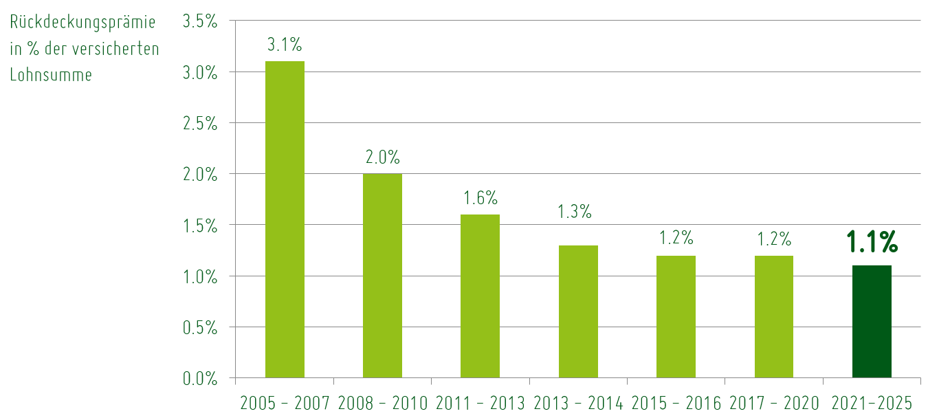 Die Tatsache, dass es dem RV-Pool gelungen ist, das Prämienniveau auf den sehr tiefen 1.2% zu halten ist umso erstaunlicher, weil die Rückversicherer und die dem RV-Pool angeschlossenen Pensionskassen in den vergangenen Jahren ihre technischen Zinssätze immer weiter reduziert haben. Sinkende technische Zinssätze bedeuten nämlich automatisch steigende Prämien bei gleichem Schadenverlauf, denn bei sinkenden technischen Zinssätzen müssen pro Leistungsfranken höhere Reserven gebildet werden!